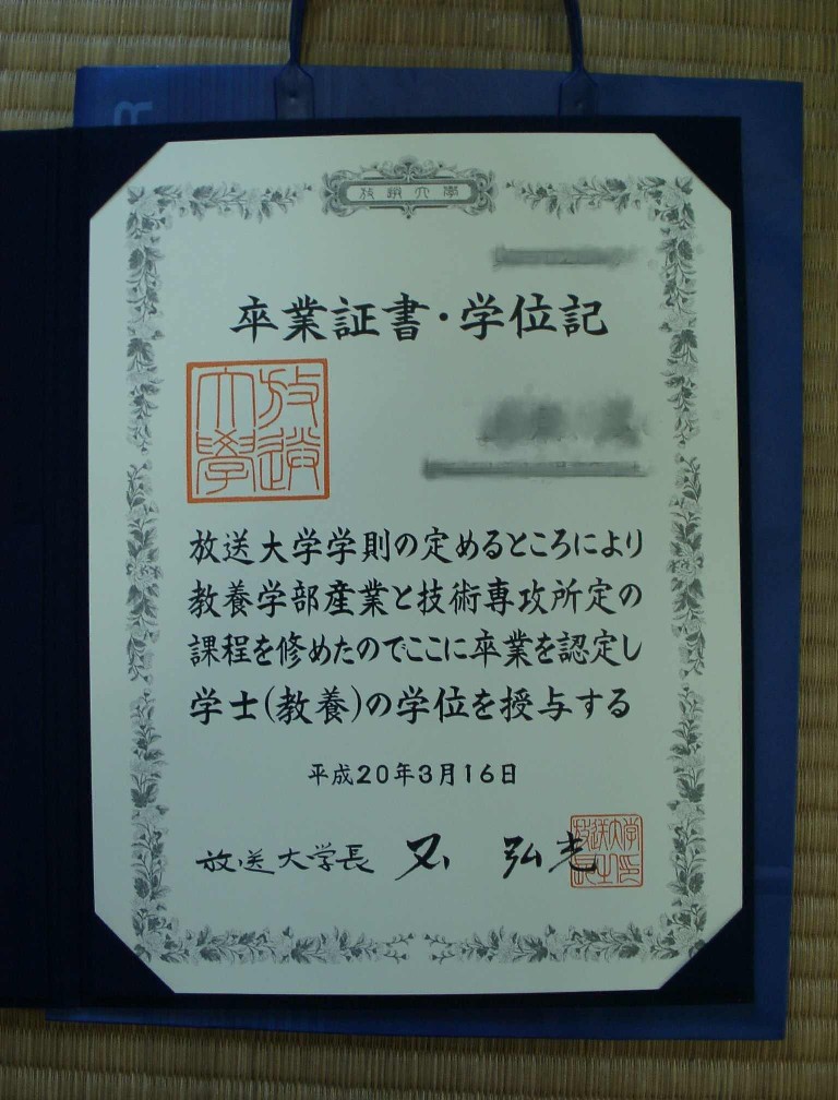 沖縄学習センターの方の話によると、人口比率で比較すると沖縄は放送大学への入学者は全国で4番目位と上位に位置するそうだが、卒業者で比較すると下位に位置するそうだ。 私は入学から卒業まで9年を要したので、この卒業比率を下げるのに大いに貢献したということだろう。
